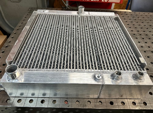 La deuxième étape consiste à fabriquer de nouvelles boîtes en aluminium, d’y souder les arrivées et départs d’eau et d’huile. On aperçoit sur les photos les nouveaux éléments avant l’assemblage. Les boîtes sont ensuite rapportées au faisceau toujours par soudure.