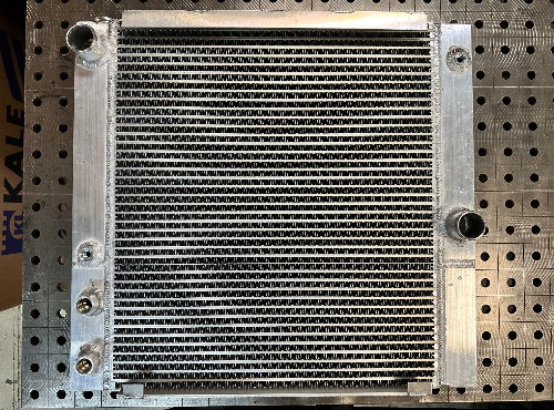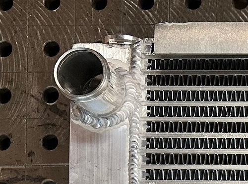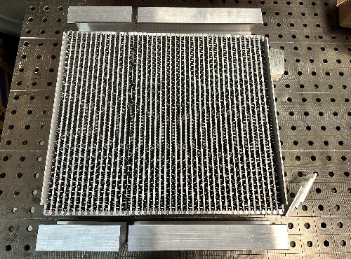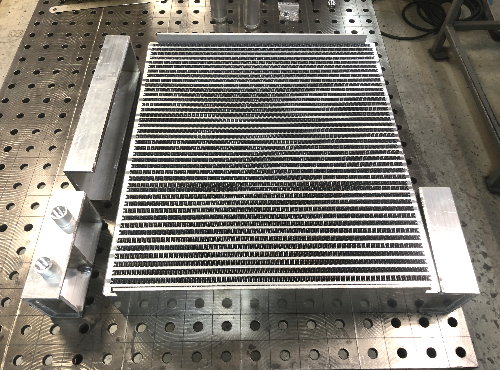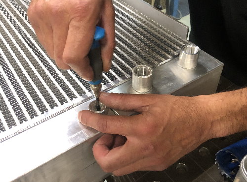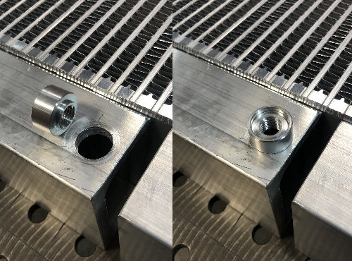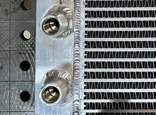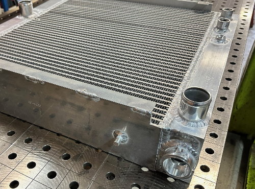 La deuxième étape consiste à fabriquer de nouvelles boîtes en aluminium, d’y souder les arrivées et départs d’eau et d’huile. On aperçoit sur les photos les nouveaux éléments avant l’assemblage. Les boîtes sont ensuite rapportées au faisceau toujours par soudure.