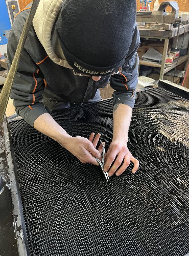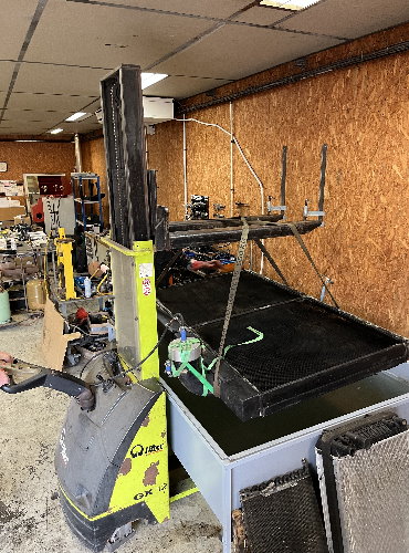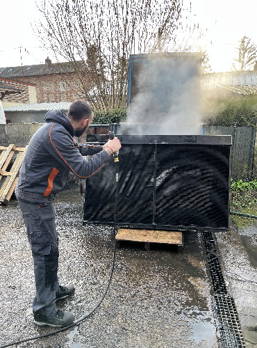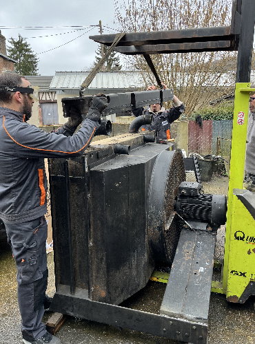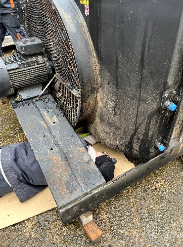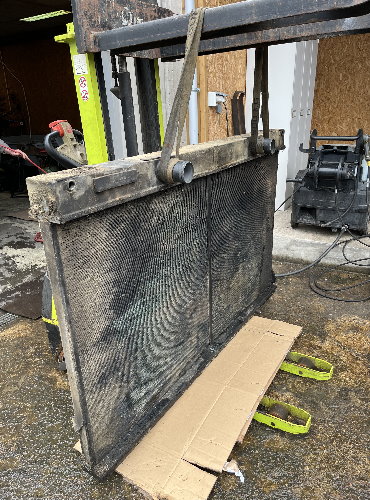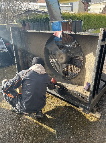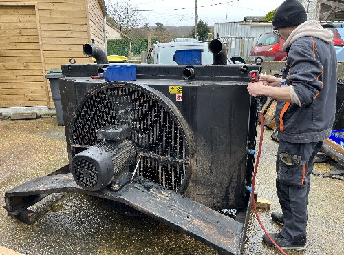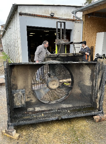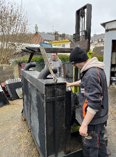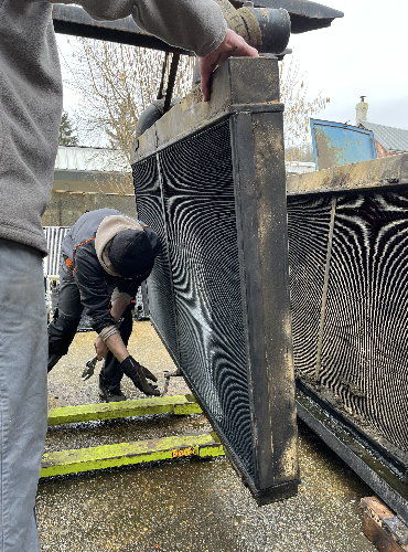 L’opération suivante est celle du démontage, toujours délicate compte tenu de la fragilité des faisceaux en cuivre. La persévérance est de mise puisque cet ensemble n’a pas été démonté depuis des décennies. La souplesse est également requise pour aller desserrer des écrous bien cachés. Arthur, le collaborateur chez Proradia s’est allongé afin d’accéder au-dessous du « gros bébé ». La grille de protection, les deux radiateurs, le ventilateur ont été désolidarisés de la structure porteuse avec son moteur. L’utilisation d’un chariot élévateur est indispensable compte tenu du poids des pièces.