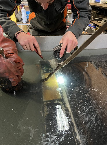 Afin de rechercher toutes les fuites, les radiateurs sont mis en pression dans un bac à eau. Certains endroits corrodés suggéraient des probables fuites mais il est impératif d’en repérer l’ensemble. Il est également judicieux de réparer les parties détériorées ne présentant pas encore de fuite. Le diagnostic ne s’effectue pas à la loupe comme Sherlock Holmes, mais nous n’en sommes pas loin puisque l’inspection très précise s’effectue avec une lampe à led pour traquer la moindre bulle qui s’échapperait du radiateur sous pression d’air.